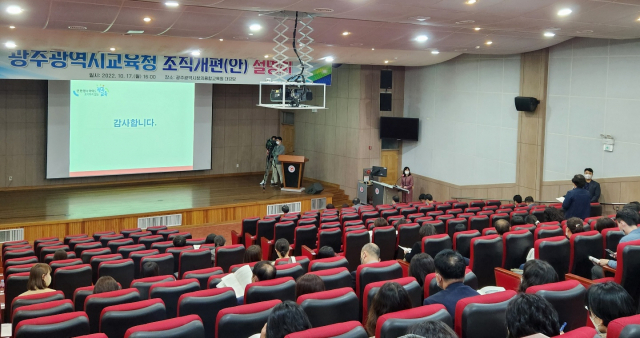 지난 17일 오후 광주 동구 창의융합교육원 대강당에서 '광주시교육청 조직개편(안) 설명회'가 열렸다. 시교육청 교육자치과 관계자가 발제자로 나서 총 50여차례가 넘는 회의의 경과보고와 조직개편안의 개략적인 내용을 발표했다.