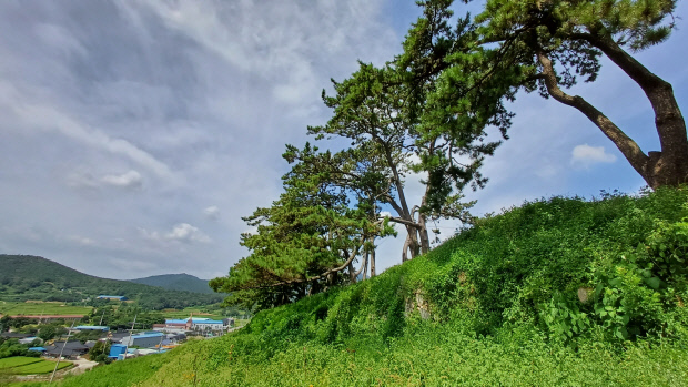 성곽을 둘러싼 방풍림이 눈길을 끈다. 수령 100∼300년 된 해송 60여 그루가 무리를 지어 있다. 해송숲에 전망데크도 만들어져 있다. 우거진 풀숲을 헤치고 올라가니, 시원한 숲그늘을 선사한다. 기둥이 두 갈래로 쭈욱- 뻗어 여인을 연상케 하는 소나무도 있다. 70년대 후반 ‘하사와 병장’이 부른 노래 ‘해남아가씨’가 절로 흥얼거려진다. ‘구름도 내맘인 양 그님 모습 그리고…. 바람도 반기는 양 내뺨을 스치고….’
