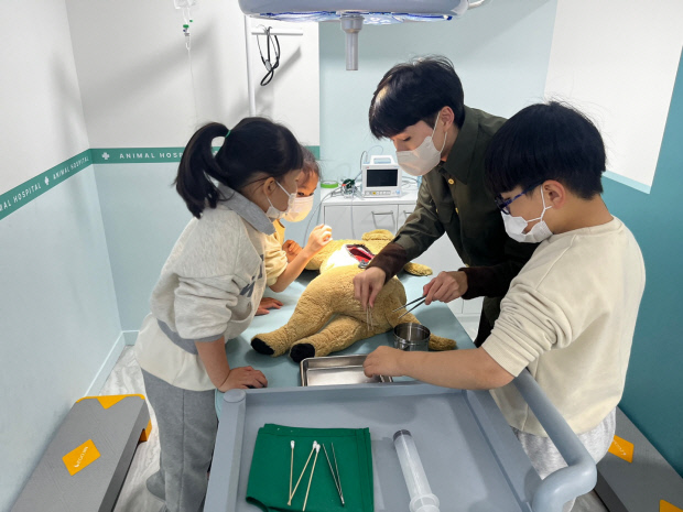 키즈라라 내 동물병원에는 1학년 오소연양과 2학년 김하원군이 수의사 가운을 입고 수술대 앞에 섰다.인형 강아지 ‘몽이’를 대상으로 마취를 하고 절개, 봉합까지 모든 수술 과정을 체험했다.