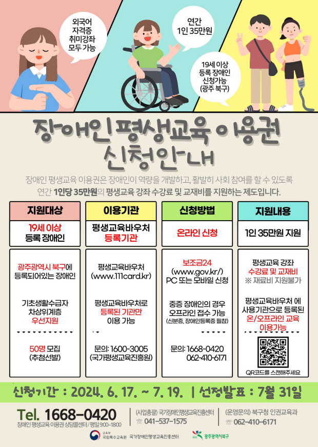 공모 선정에 따라 북구는 19세 이상 등록 장애인 50명에게 평생교육 강좌 수강료 및 교재비로 쓸 수 있는 평생교육 바우처를 인당 연간 최대 35만 원까지 지원할 계획이다.