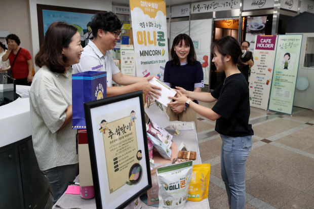 이날 10시부터 구청 1층에선 중증 장애인 생산품을 주민, 공직자에게 알리는 특별판매전이 열렸다. 차, 쌀과자, 주먹밥, 친환경 생활용품, 용돈 봉투 등 다양한 생산품을 전시, 판매했다.