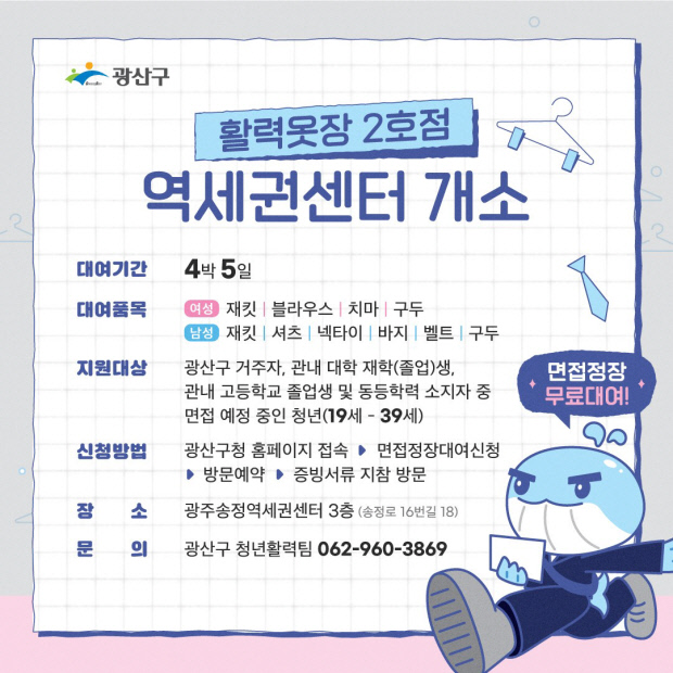 활력옷장에 대한 자세한 사항은 광산구 시민경제과 청년활력팀(062-960-3869)에 문의하면 된다.