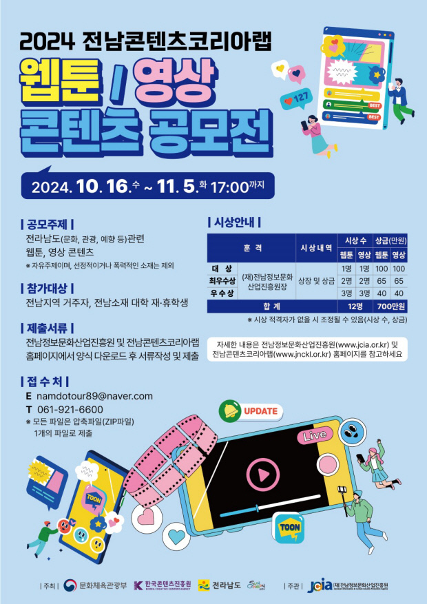 (재)전남정보문화산업진흥원은 전남의 매력을 담은 참신한 콘텐츠를 모집하고자 ‘2024년 전남콘텐츠코리아랩 콘텐츠 공모전’을 개최한다고 23일 밝혔다.