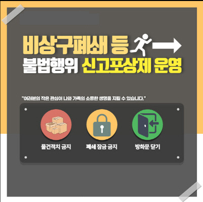 불법행위 신고포상제는 소방시설을 차단·고장 상태로 방치하거나 비상구 폐쇄·잠금 행위를 신고하는 시민에게 포상금을 지급하는 제도로 불법행위를 근절하고 안전의식을 확산하고자 마련됐다.