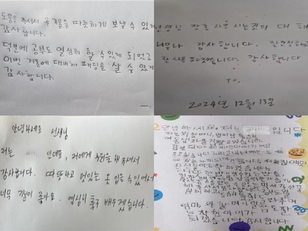일찍 어머니를 여의고 외할머니와 살고 있는 지우(14·가명)는 금세 작아져 버려 불편한 외투와 신발 대신 새로운 겨울점퍼와 운동화를 선물받았다. 지우는 편지를 통해 “산타의 소중한 선물로 올 겨울을 따뜻하게 보낼 수 있게 돼 감사한 마음”이라며 “앞으로 공부를 더 열심히 해서 이웃들에게 많은 도움과 힘을 줄 수 있는 성숙한 어른으로 성장하겠다”고 밝혔다.